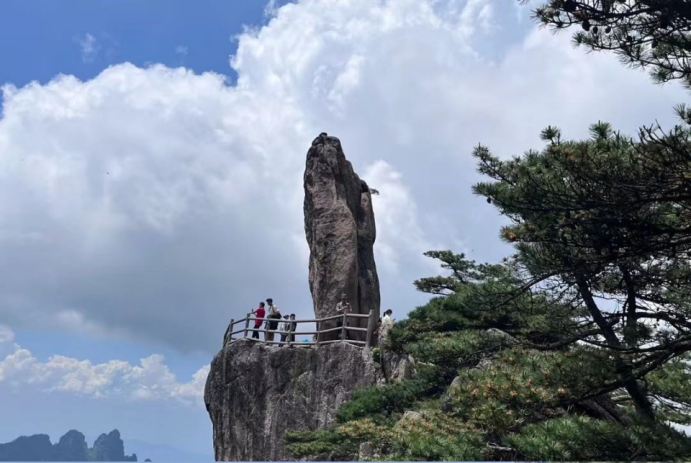我們的目的地是迎客松和光明頂。迎客松是黃山的標(biāo)志性景觀,樹齡至少已有1300年,是黃山“五絕”之一。古往今來,無數(shù)文人墨客贊美松樹,欣賞它頑強(qiáng)的生命力,能夠在貧瘠的土地上生長,不畏嚴(yán)寒,不懼刮風(fēng)下雨。這也如同企業(yè)發(fā)展一樣,面對困難,只要努力拼搏、永不放棄,就一定能夠迎來新氣象,開啟新篇章。